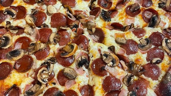 Cheese, onion, black olives, pepperoni, sausage, green olives, fresh mushrooms, anchovies, green peppers, Banana peppers, and hot cherry peppers